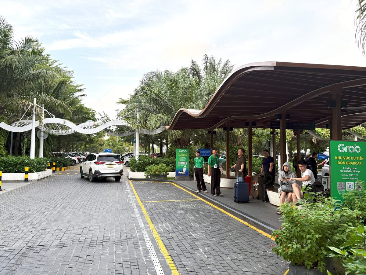 ダナン国際空港国際線ターミナルのaap pickup(Grab乗り場)。2025年10月現在は、緑のGrabシャツを着たスタッフが合流までのサポートをしてくれています。