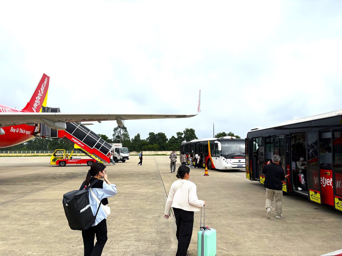 航空機から降り、空港ターミナルまではバスで向かいます。