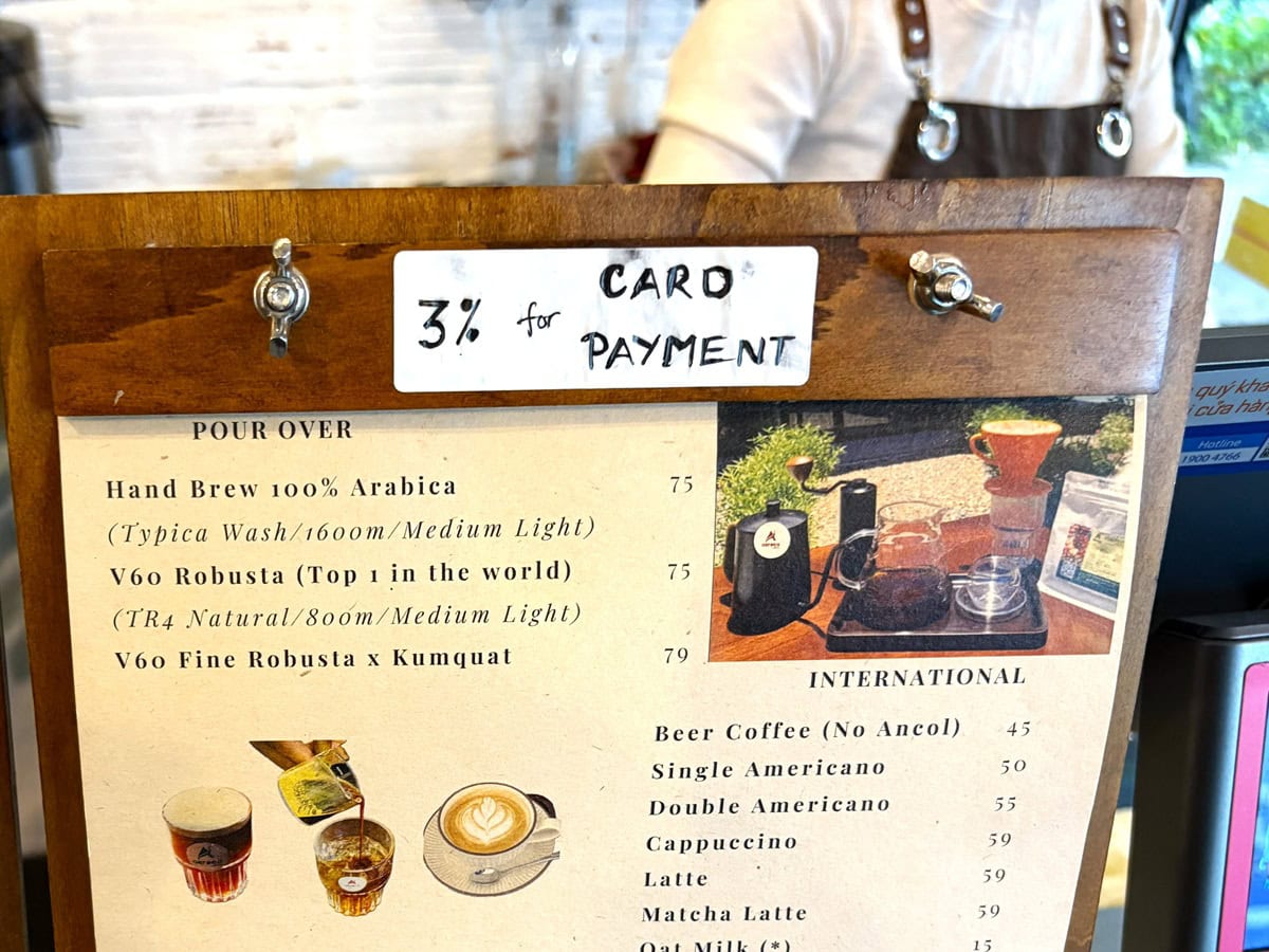 ダナンにあるカフェ。クレジットカードで決済すると、3%の手数料が発生すると書かれています。